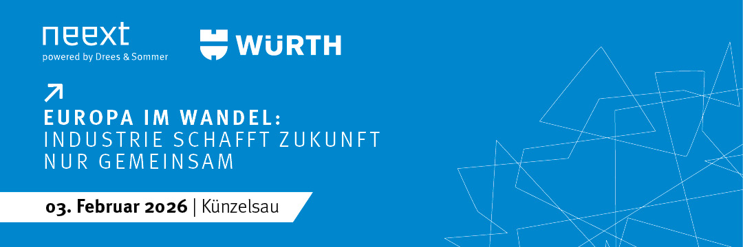 Gemeinsam mit unserem Gastgeber und neext-Partner, der Adolf Würth GmbH & Co. KG und zahlreichen weiteren Unternehmen aus Industrie, Automotive, Energie, Logistik, Forschung, Politik sowie der Stadt- und Standortentwicklung möchten wir uns diesen Fragen widmen und laden Sie herzlich – im Vorfeld des Gipfeltreffens der Weltmarktführer – zum neext Industry Auftaktforum „Europa im Wandel: Industrie schafft Zukunft nur gemeinsam“ am 03. Februar 2026 ins Carmen Würth Forum nach Künzelsau ein.